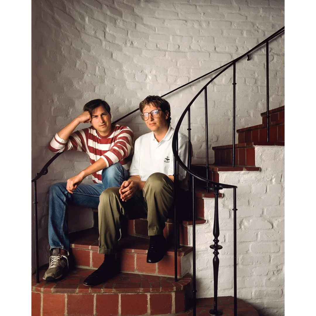 This was shot in 1992 for a Fortune cover at Steve Job’s house. From what I know, it is the only posed photograph of them ever taken. They were whispering the most competitive craziness to each other while smiling at me, competitive and crazy tough. “You will never beat me at anything,” Bill Gates said under his breath to Jobs. Then he adjusted it a bit, “You may tie me, but you will never beat me.” High tech gangsters.