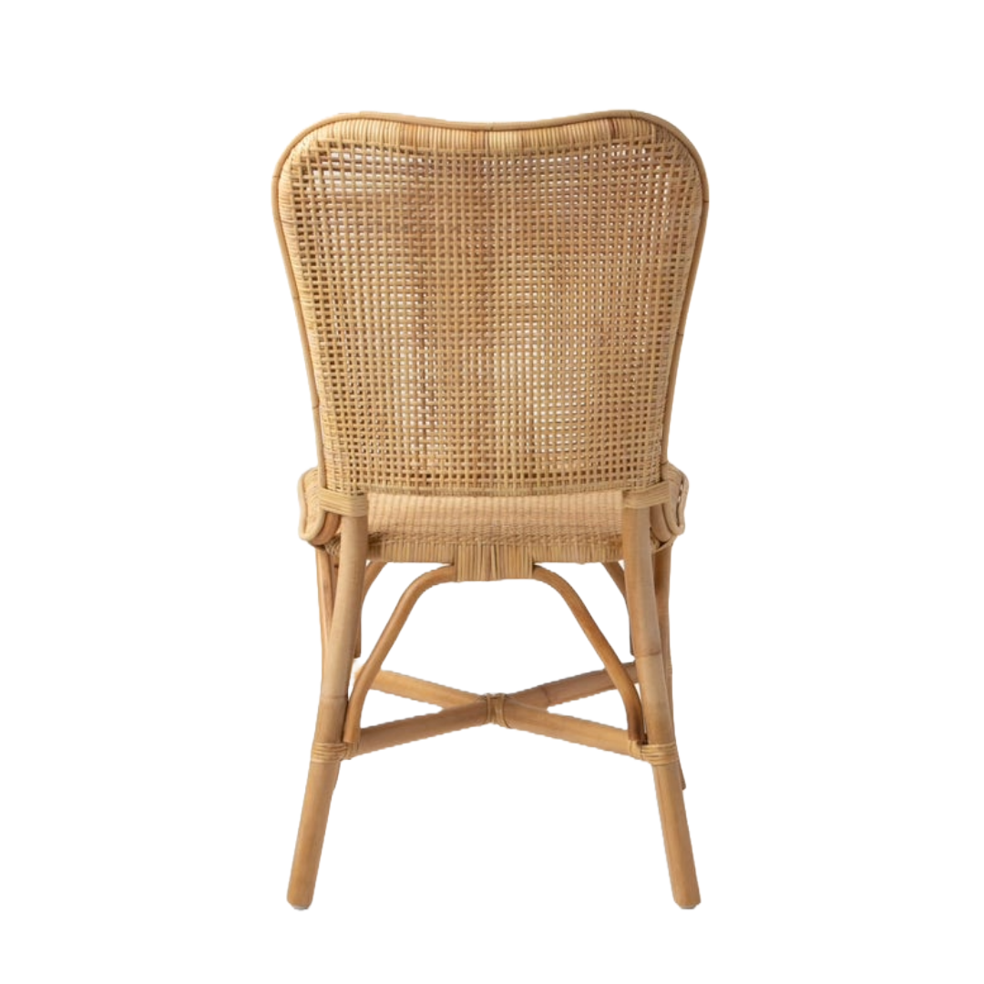 The Evangeline Dining Chair blends airy elegance with artisanal detail. Its open-weave cane back and seat are framed in natural rattan, secured with hand-applied lacing for a clean, tailored finish. An X-stretcher base adds strength and structure, while subtle bindings at the joints highlight the craftsmanship throughout.
