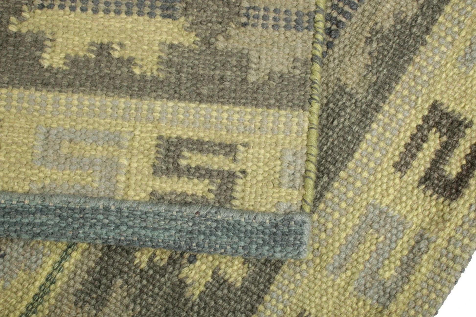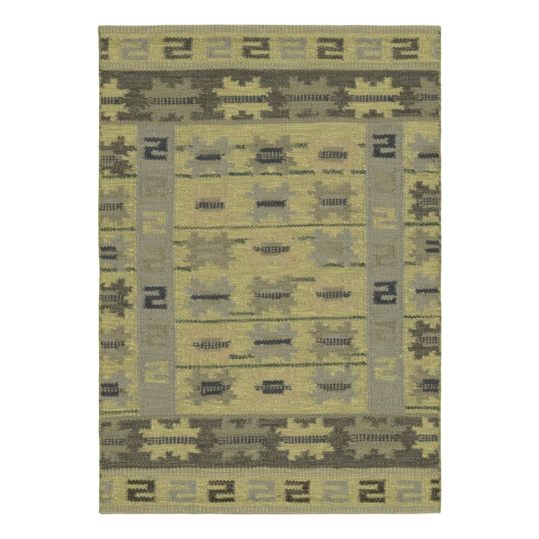 This new flat weave reinvents vintage Scandinavian Kilim in ways that both honor the Swedish minimalist aesthetic and modernize its construction. The use of undyed natural yarns, for example, lends a subtle striae with more of a sense of movement and depth—a subtle nod to Rollakan techniques in a modern fashion. This particular rug enjoys rich blue, green and gray geometric patterns.