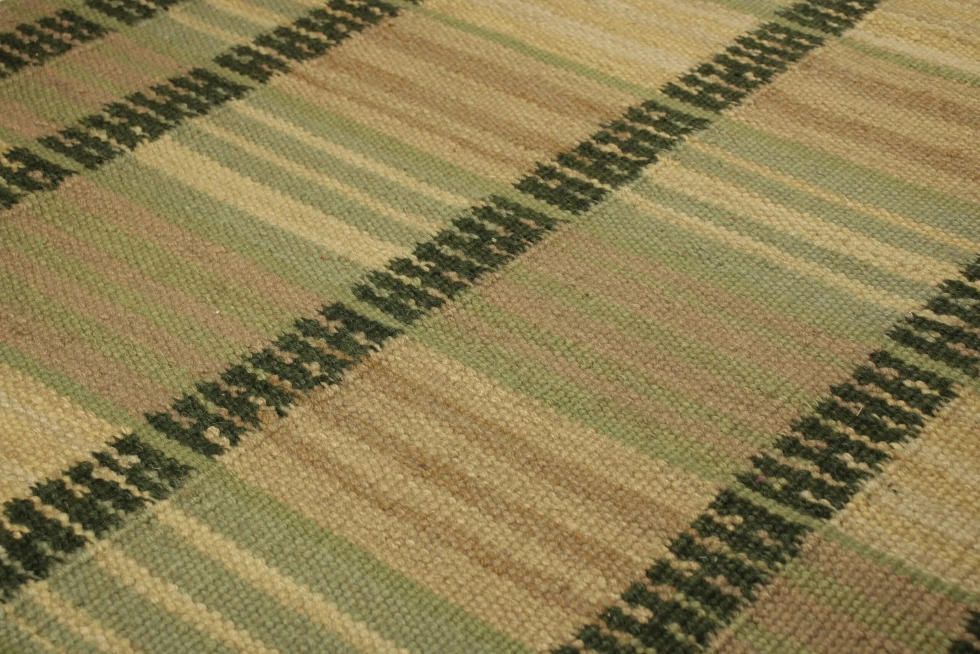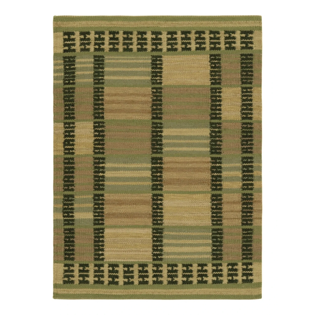This new flat weave reinvents vintage Scandinavian Kilim in ways that both honor the Swedish minimalist aesthetic and modernize its construction. The use of undyed natural yarns, for example, lends a subtle striae with more of a sense of movement and depth—a subtle nod to Rollakan techniques in a modern fashion. This particular rug enjoys muted shades of green, beige, taupe and pink geometric stripes.