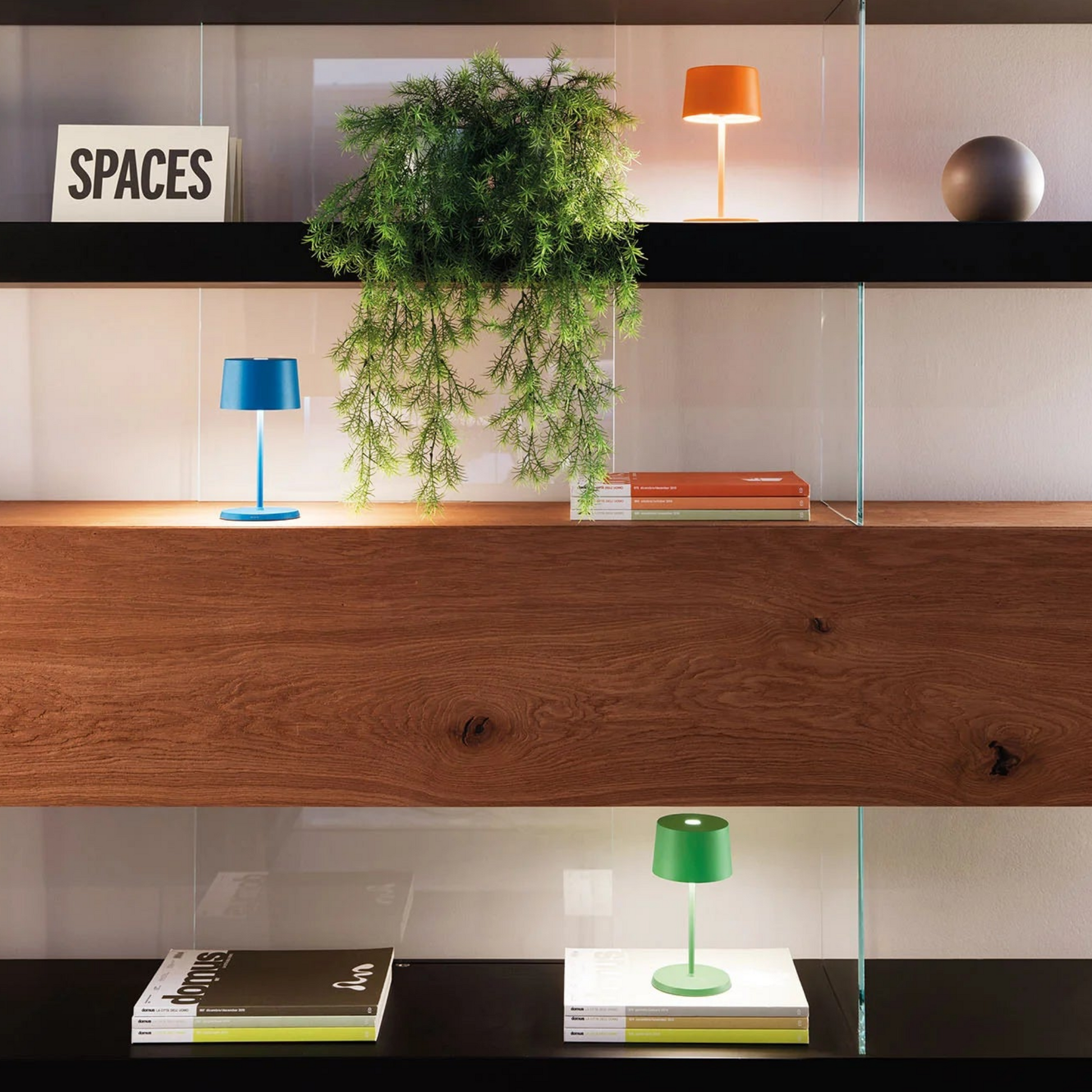Add a pop of color to your space with the stylish and versatile Zafferano Olivia Mini Table Lamp, a perfect blend of form and function. This rechargeable lamp adds a chic touch to any room, effortlessly enhancing your decor with its sleek design and vibrant hues.